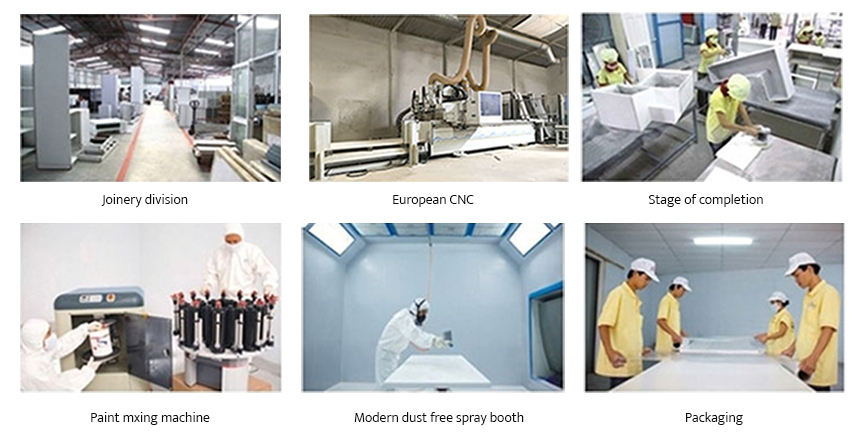 Ozvie Group’s factory is located in District 12, Ho Chi Minh City and has two divisions: Paint and Joinery. Our Paint division is equipped with state-of-the-art industrial equipment, paint mixing machine and dust-free spray booths. Our Joinery division has a range of heavy machineries including computerised beam saw, automatic edging machine, sanding machine and CNC machines.